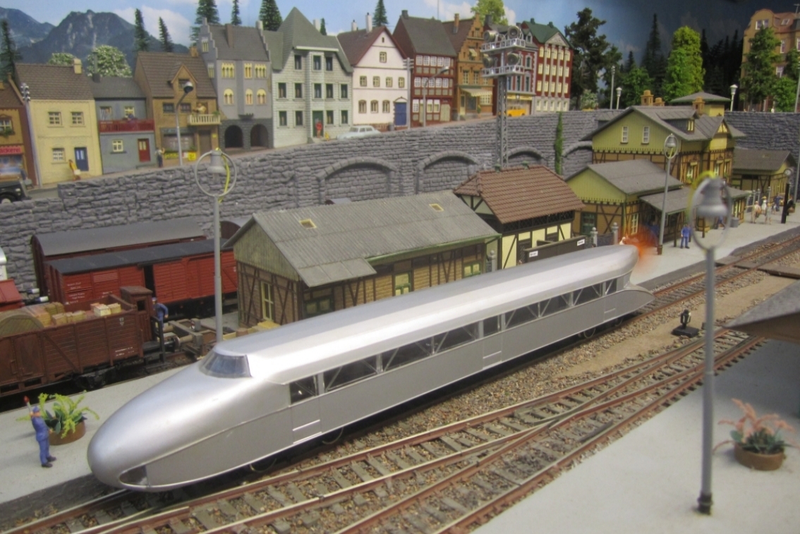 The 'Rail Zepplin' departing from Nebenstrad Station, Pity the people behind it. |